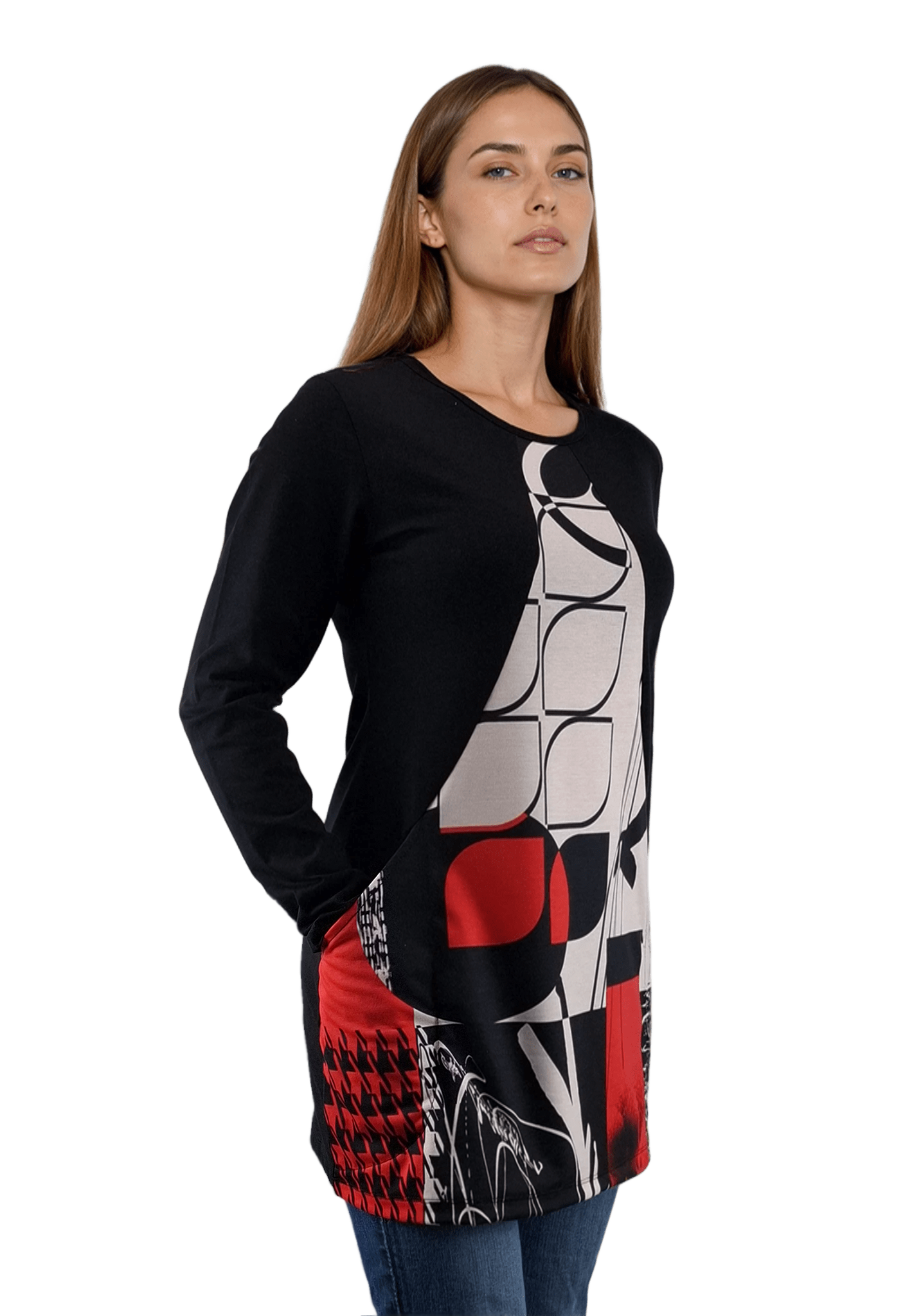 - Дамска блуза-туника асиметрична с дълъг ръкав обло деколте